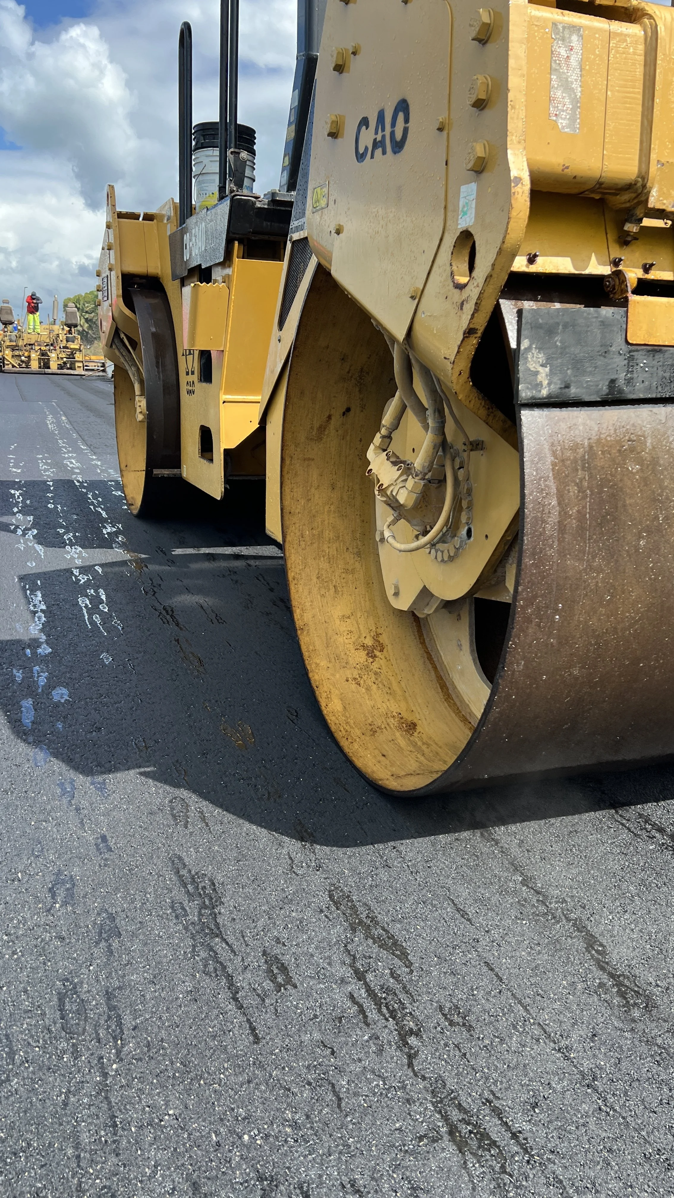 Close-up of a yellow road roller compacting asphalt during road construction, with construction workers and equipment in the background under a partly cloudy sky.
